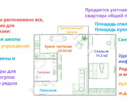 В Калининском р-не Санкт-Петербурга продается уютная евро-двухкомнатная квартира, состоящая из одной спальни площадью 14 м2, совмещенной кухни-гостиной площадью 23.44 м2, прихожей и совмещенного санузла. Из гостиной комнаты имеется выход на застекленный балкон.
