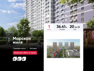 Продается 1-комнатная квартира в ЖК "Морская миля" на 20 этаже. Общая площадь составляет 36.41 кв. м. Квартира с чистовой отделкой. Жилой комплекс "Морская миля" располагается по адресу Санкт-Петербург, Красносельский.