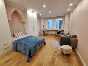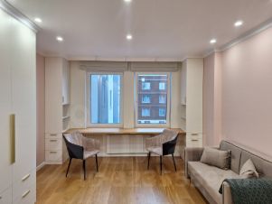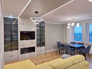 В квартире выполнен дизайнерский ремонт из высококачественных материалов: встроенная мебель во всей квартире, экокамин, дубовые двери, дубовый однополосный паркет, полы с подогревом, подоконники из лиственницы, керамогранит, обои под покраску, интерьерное разноуровневое освещение. Квартира полностью мебелирована.