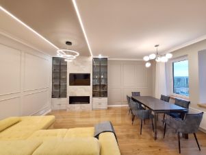 Объединенная кухня-гостиная 38 м2 с большим кухонным гарнитуром, с двумя встроенными холодильниками, посудомоечной машиной, духовым шкафом и микроволновкой. Отдельный кухонный остров. Удобная спальня (14,5 м2) с вместительной гардеробной (5 м2) с различными зонами хранения. Большая детская в 23 м2. Два просторных санузла с очень большой ванной и душевой. Отличная планировка квартиры идеально подойдет для семьи с детьми. Два вместительных балкона с фасадным остеклением, выходящие на разные стороны, делают квартиру очень светлой и уютной.