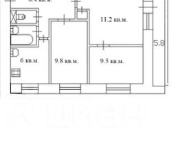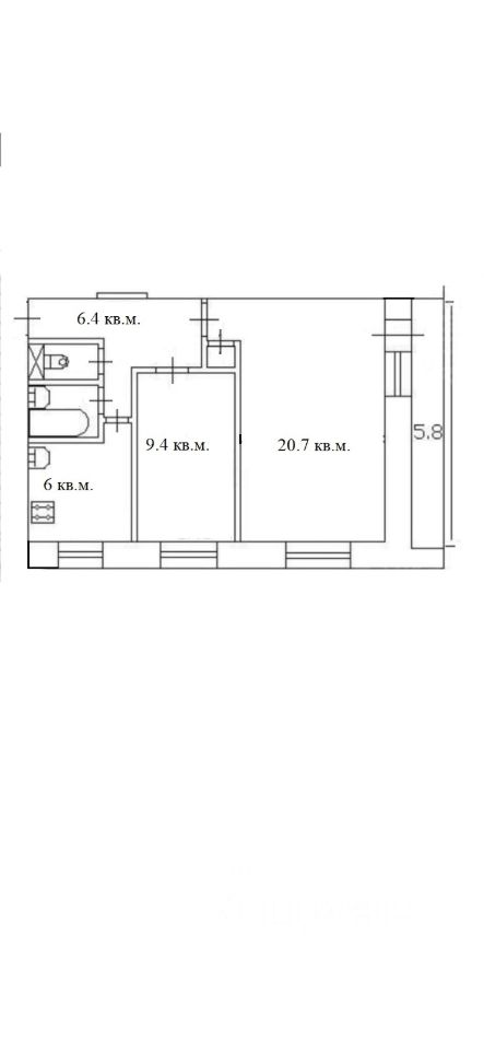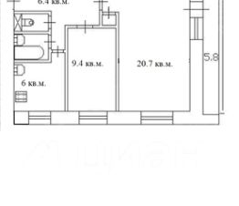 Общая площадь 47 кв.м. + 5.8 кв.м. балкон. Комната 20.7 +9.4 кв.м. Кухня 6 кв.м. Коридор 6.4 кв.м. Высота потолков 2.5 метра. 5-й этаж 9-ти этажного кирпичного дома. Дом 1966 года постройки.