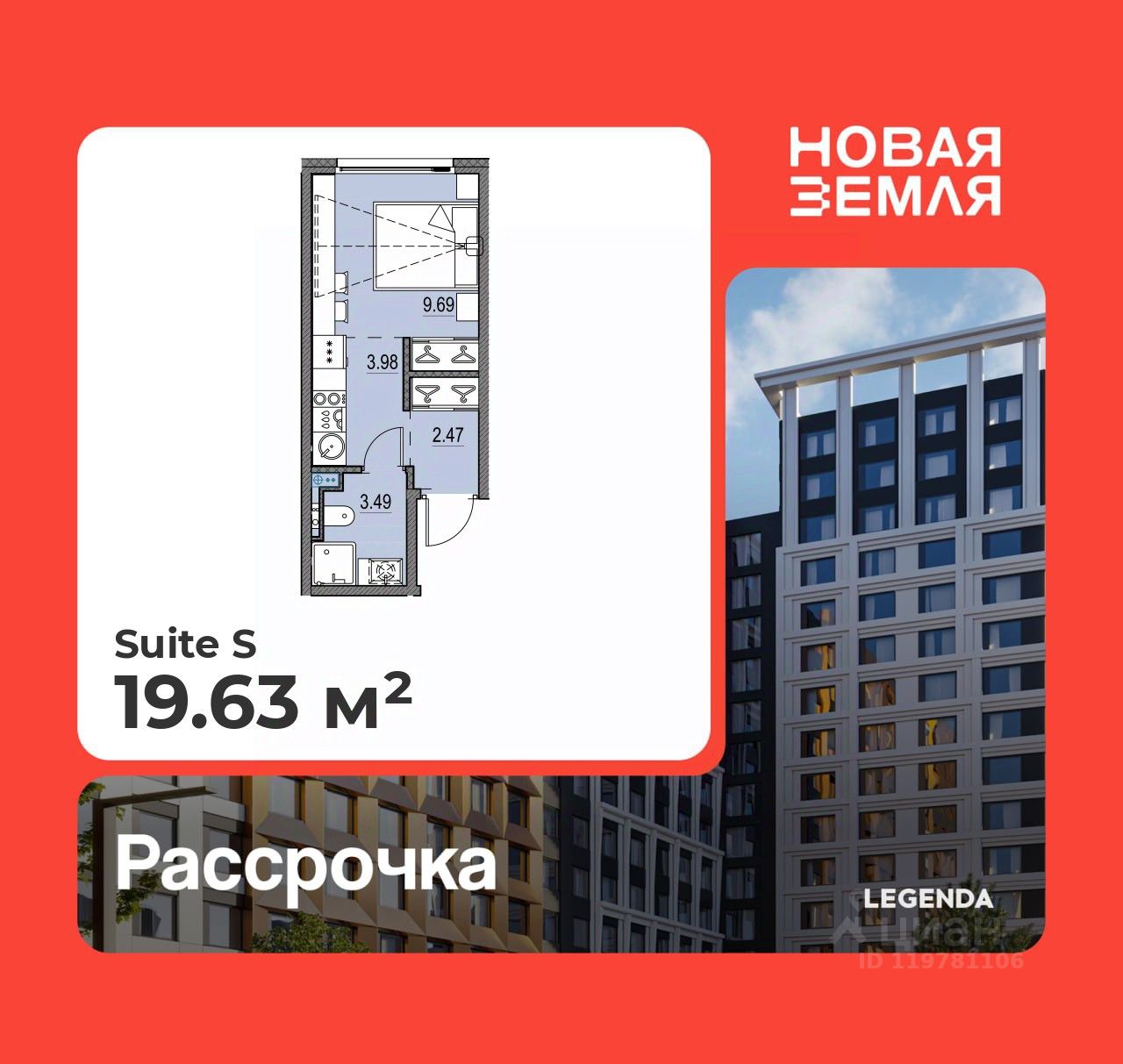 1-комн. квартира-студия от застройщика с предчистовой отделкой в ЖК "Новая Земля" на 16 этаже. Общая площадь: 19.63 кв.м., площадь гостиной 13.67 кв.м., из которых 3.98 кв.м. выделено под кухонную зону. Все окна выходят на одну сторону. В квартире один совмещенный санузел. Высота потолков 2.85 м.