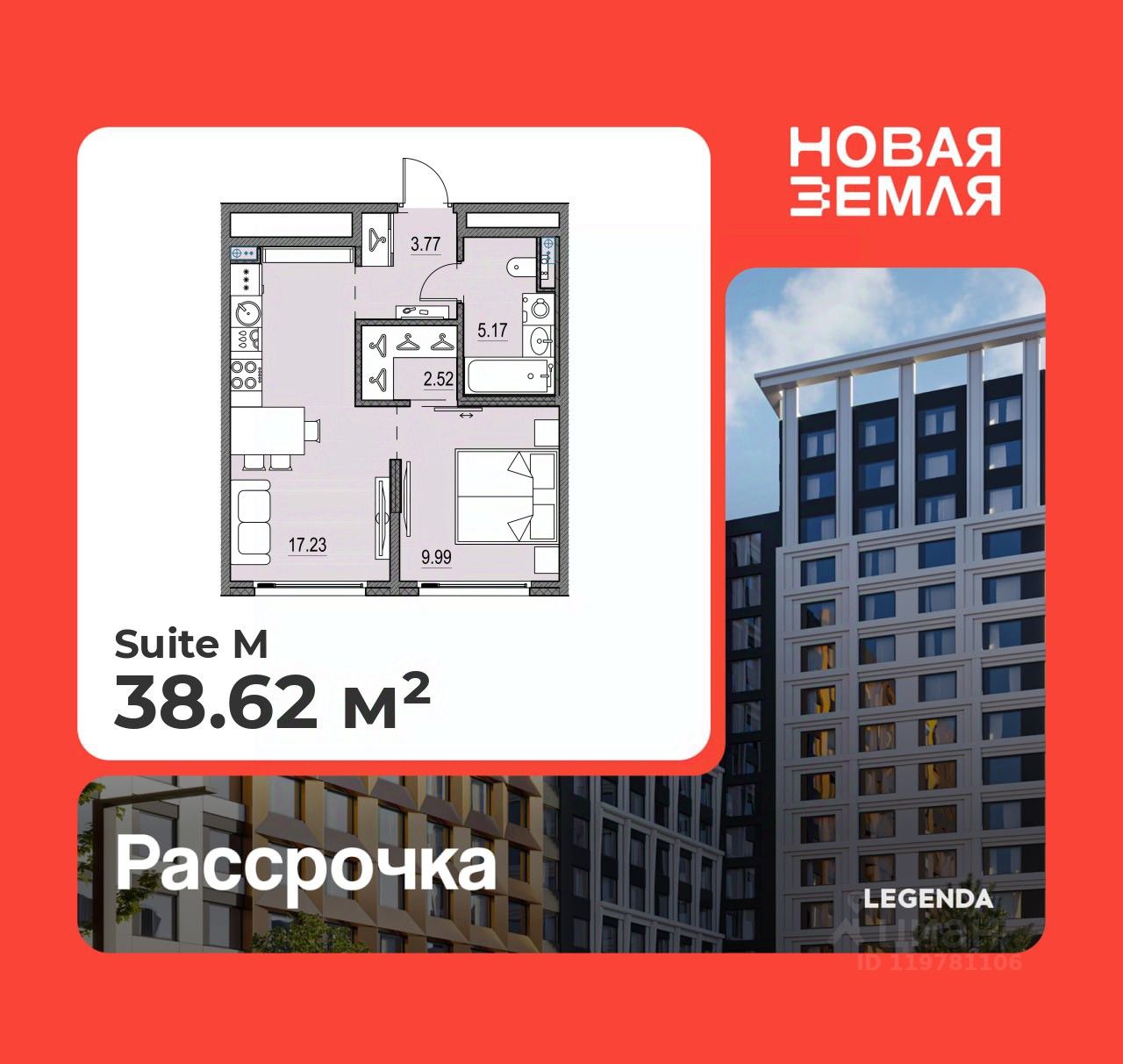 1-комн. квартира с предчистовой отделкой в ЖК "Новая Земля" на 11 этаже. Общая площадь: 38.62 кв.м., жилая: 9.99 кв.м., площадь просторной кухни-столовой: 17.23 кв.м. Все окна выходят на одну сторону. В квартире один совмещенный санузел. Высота потолков 2.85 м.