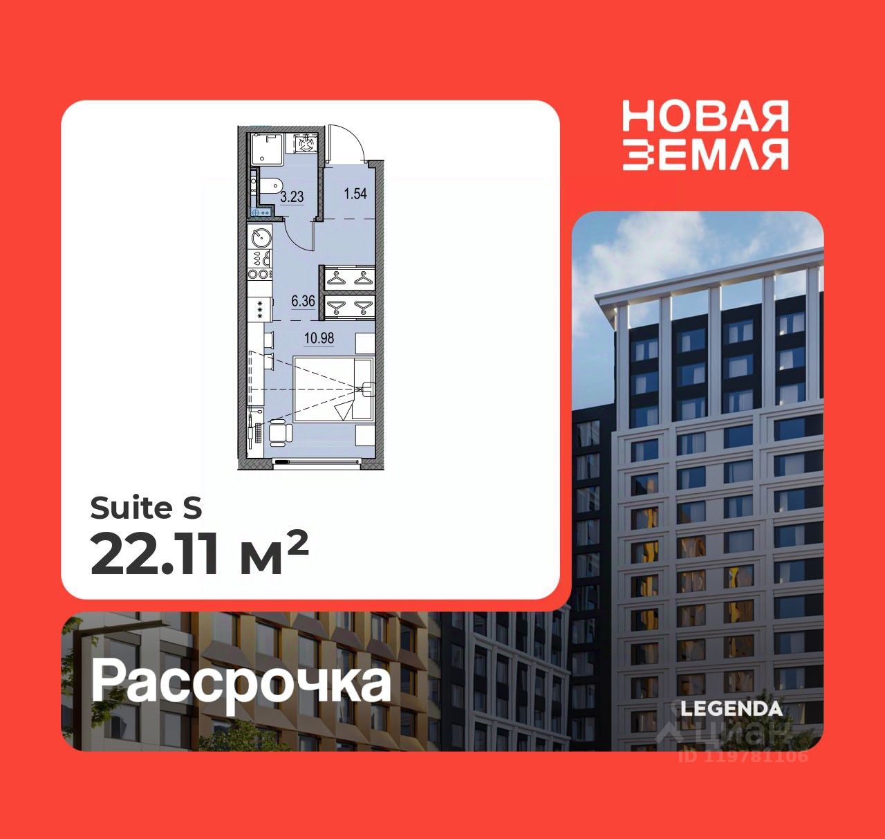 Однокомнатная квартира-студия от застройщика с предчистовой отделкой в ЖК "Новая Земля" на 5 этаже. Общая площадь: 22.11 кв.м., площадь гостиной 17.34 кв.м., из которых 6.36 кв.м. выделено под кухонную зону. Все окна выходят на одну сторону. В квартире один совмещенный санузел. Высота потолков 2.85 м.