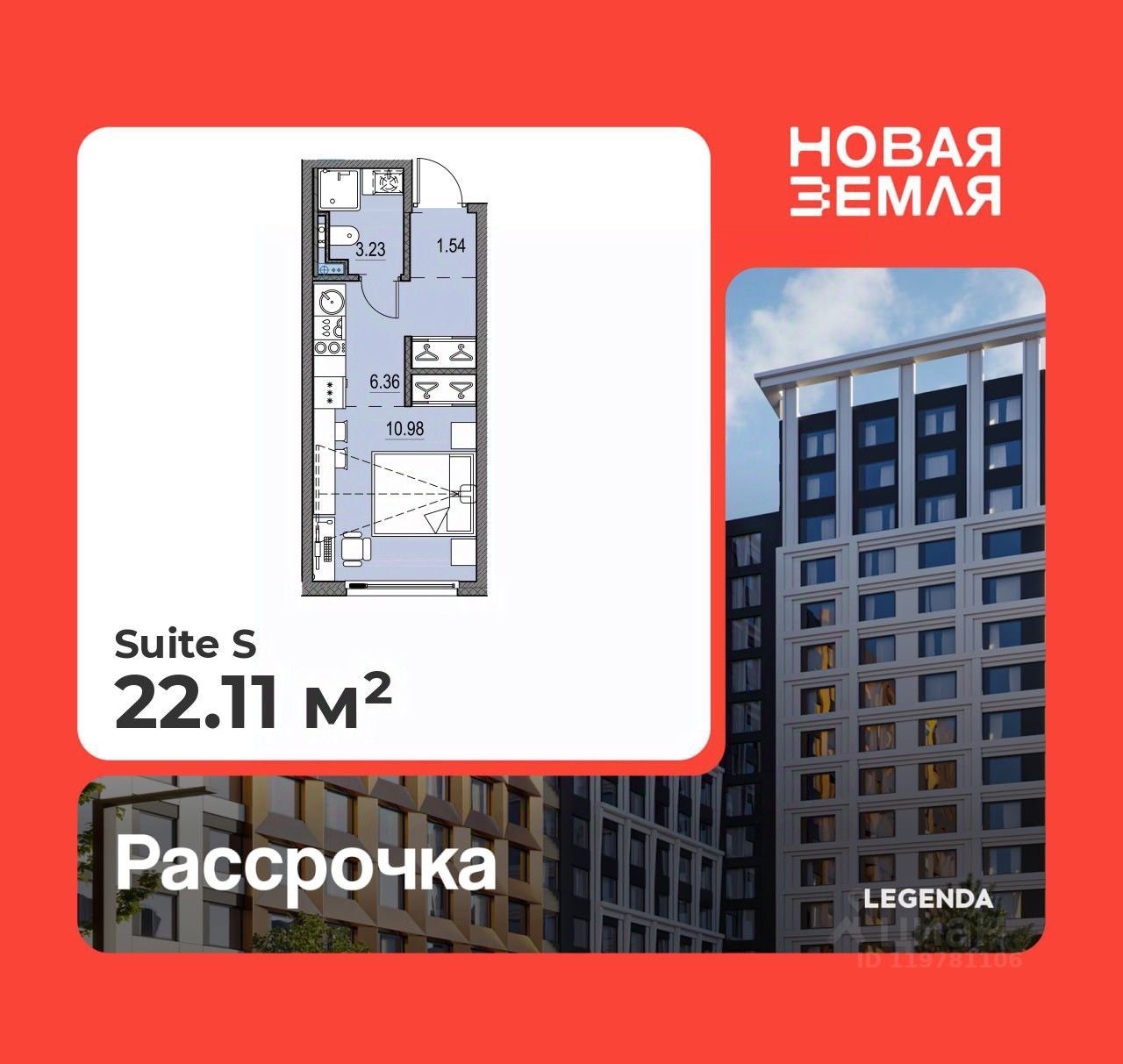 1-комн. квартира-студия с предчистовой отделкой в ЖК "Новая Земля" на 15 этаже. Общая площадь: 22.11 кв.м., площадь гостиной 17.34 кв.м., из которых 6.36 кв.м. выделено под кухонную зону. Все окна выходят на одну сторону. В квартире один совмещенный санузел. Высота потолков 2.85 м.