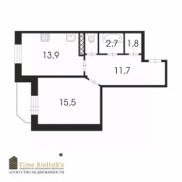 Квартира площадью 47 кв.м. включает в себя кухню-гостиную 14 кв.м, комнату 15,5 кв.м с выходом на застекленную лоджию, раздельный санузел, просторную прихожую 11.7 кв.м и кладовку.