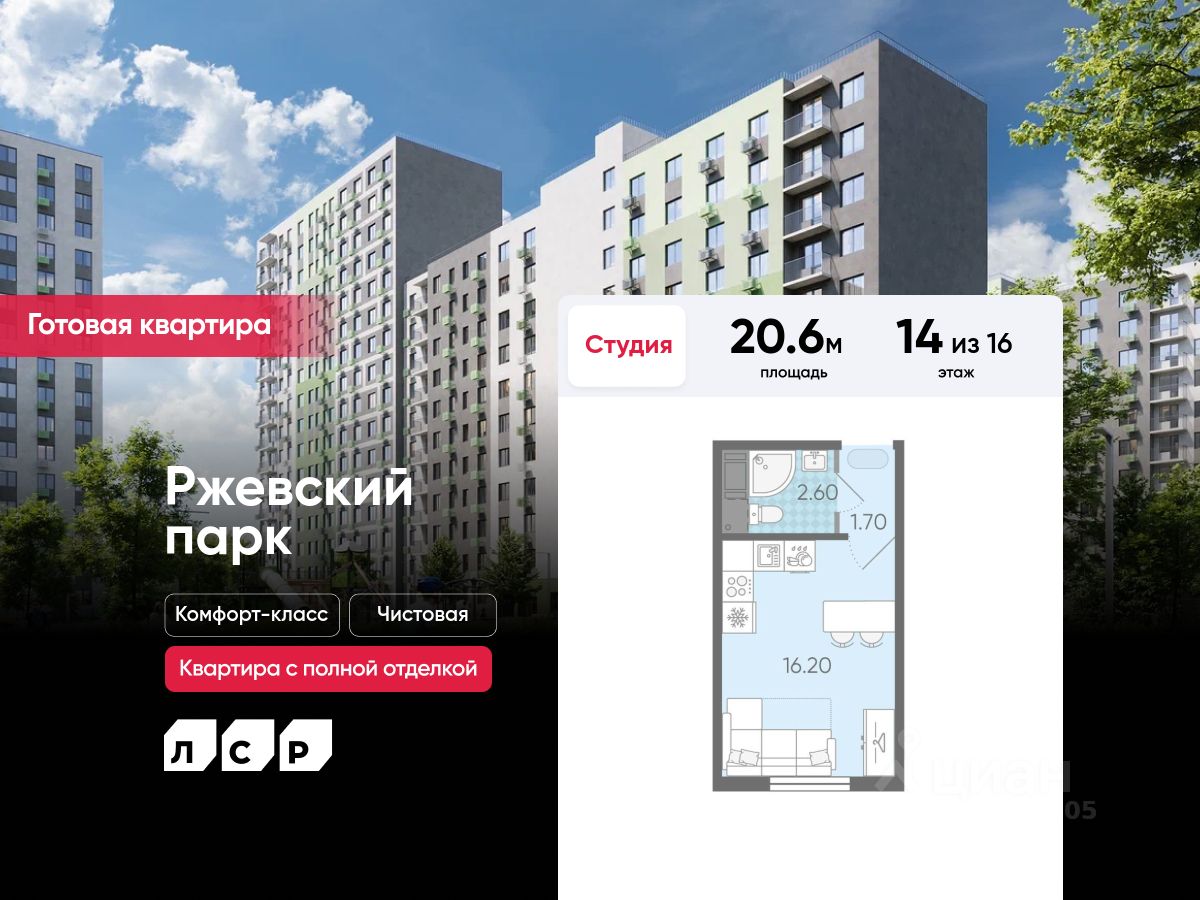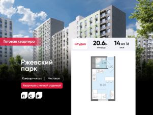 Продается студия в ЖК "ЛСР. Ржевский парк" на 14 этаже. Общая площадь составляет 20.60 кв. м. Квартира с чистовой отделкой. Жилой комплекс "ЛСР. Ржевский парк" располагается по адресу Ленинградская область, Всеволожский район, Ковалёво пос..