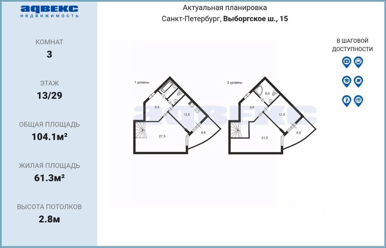 Второй уровень ( 14 этаж): Ваше частное убежище. Просторная спальня 21.5 кв м и уютная детская 12.6 кв м . Лестница из натурального дерева связывает этажи, добавляя уюта и стиля. На каждом уровне есть санузел и встроенные места для хранения. Главная особенность: все комнаты имеют панорамные окна в пол, которые дарят ощущение простора и открывают живописные виды. Ваш день начинается с вида на Суздальские озера и заканчивается фантастическими закатами.