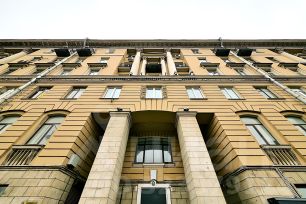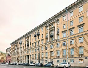 Двухсторонняя трехкомнатная квартира на набережной Макарова, с роскошными панорамными видами, двумя балконами и высокими потолками 3,25 м в доме сталинского неоклассицизма.
