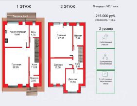 ОБЩАЯ площадь 163,10 кв.м., ДВА раздельных санузла 7,89 + 4,75 кв.м., большой холл 11,28 кв.м., огромная кухня-столовая 19,9 кв.м., просторные комнаты 27,55 + 17,36 + 13,63 кв.м., имеется терраса на первом этаже с выходом из кухни, открытый французский балкончик на втором этаже.