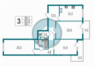 Квартира с продуманной планировкой для всей семьи: оборудованная кухня-гостиная 15,3 м2, три просторные комнаты правильной формы: 20,9м2, 20,3м2, 14,9м2, есть места для хранения, светлый коридор с окном, два санузла.
