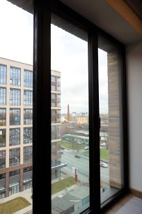 Высокие потолки и большие панорамные окна, из которых под углом есть вид на Малую Неву и Уральскую улицу.