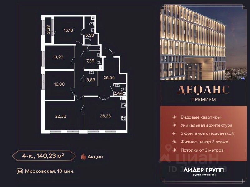 ЖК "Дефанс Премиум". Строительство завершено. Дом получил заключение о соответствии и готовится к вводу! Это проект авторской архитектуры с уникальными форматами квартир в 10 минутах ходьбы от станции метро "Московская". Дом выполнен в виде двух 23-х этажных арок, основания которых объединены единым внутренним пространством с большой парадной лестницей, променадом и большим фонтанным комплексом с подсветкой. В составе проекта построен большой фитнес-центр с бассейнами и зоной СПА. Часть квартир отделена от остальных жилых этажей специальным техническим этажом — это снимает все ограничения по перепланировке. Для части квартир предусмотрены индивидуальные входные группы и дополнительные лифты премиального немецкого бренда Tyssen Krupp (TKE). Фасады, облицованные испанской керамикой и алюминиевые панорамные окна с энергоэффективными стеклами AGС Energy подчеркивают высокий статус дома. На квартиры ЗПИФ и переуступки семейная ипотека не распространяется!