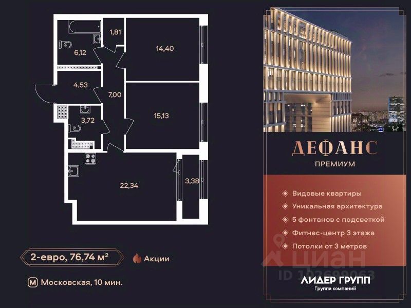 ЖК "Дефанс Премиум". Строительство завершено. Дом получил заключение о соответствии и готовится к вводу! Это проект авторской архитектуры с уникальными форматами квартир в 10 минутах ходьбы от станции метро "Московская". Дом выполнен в виде двух 23-х этажных арок, основания которых объединены единым внутренним пространством с большой парадной лестницей, променадом и большим фонтанным комплексом с подсветкой. В составе проекта построен большой фитнес-центр с бассейнами и зоной СПА. Часть квартир отделена от остальных жилых этажей специальным техническим этажом — это снимает все ограничения по перепланировке. Для части квартир предусмотрены индивидуальные входные группы и дополнительные лифты премиального немецкого бренда Tyssen Krupp (TKE). Фасады, облицованные испанской керамикой и алюминиевые панорамные окна с энергоэффективными стеклами AGС Energy подчеркивают высокий статус дома. На квартиры ЗПИФ и переуступки семейная ипотека не распространяется!