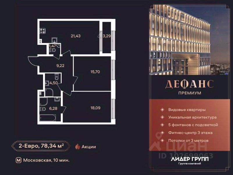 ЖК "Дефанс Премиум". Строительство завершено. Дом получил заключение о соответствии и готовится к вводу! Это проект авторской архитектуры с уникальными форматами квартир в 10 минутах ходьбы от станции метро "Московская". Дом выполнен в виде двух 23-х этажных арок, основания которых объединены единым внутренним пространством с большой парадной лестницей, променадом и большим фонтанным комплексом с подсветкой. В составе проекта построен большой фитнес-центр с бассейнами и зоной СПА. Часть квартир отделена от остальных жилых этажей специальным техническим этажом — это снимает все ограничения по перепланировке. Для части квартир предусмотрены индивидуальные входные группы и дополнительные лифты премиального немецкого бренда Tyssen Krupp (TKE). Фасады, облицованные испанской керамикой и алюминиевые панорамные окна с энергоэффективными стеклами AGС Energy подчеркивают высокий статус дома. На квартиры ЗПИФ и переуступки семейная ипотека не распространяется!