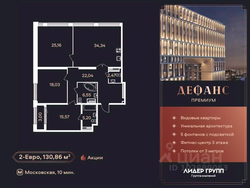 ЖК "Дефанс Премиум". Строительство завершено. Дом получил заключение о соответствии и готовится к вводу! Это проект авторской архитектуры с уникальными форматами квартир в 10 минутах ходьбы от станции метро "Московская". Дом выполнен в виде двух 23-х этажных арок, основания которых объединены единым внутренним пространством с большой парадной лестницей, променадом и большим фонтанным комплексом с подсветкой. В составе проекта построен большой фитнес-центр с бассейнами и зоной СПА. Часть квартир отделена от остальных жилых этажей специальным техническим этажом — это снимает все ограничения по перепланировке. Для части квартир предусмотрены индивидуальные входные группы и дополнительные лифты премиального немецкого бренда Tyssen Krupp (TKE). Фасады, облицованные испанской керамикой и алюминиевые панорамные окна с энергоэффективными стеклами AGС Energy подчеркивают высокий статус дома. На квартиры ЗПИФ и переуступки семейная ипотека не распространяется!