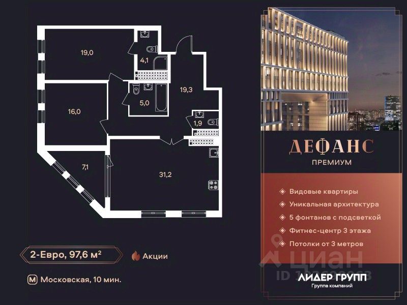 ЖК "Дефанс Премиум". Строительство завершено. Дом получил заключение о соответствии и готовится к вводу! Это проект авторской архитектуры с уникальными форматами квартир в 10 минутах ходьбы от станции метро "Московская". Дом выполнен в виде двух 23-х этажных арок, основания которых объединены единым внутренним пространством с большой парадной лестницей, променадом и большим фонтанным комплексом с подсветкой. В составе проекта построен большой фитнес-центр с бассейнами и зоной СПА. Часть квартир отделена от остальных жилых этажей специальным техническим этажом — это снимает все ограничения по перепланировке. Для части квартир предусмотрены индивидуальные входные группы и дополнительные лифты премиального немецкого бренда Tyssen Krupp (TKE). Фасады, облицованные испанской керамикой и алюминиевые панорамные окна с энергоэффективными стеклами AGС Energy подчеркивают высокий статус дома. На квартиры ЗПИФ и переуступки семейная ипотека не распространяется!