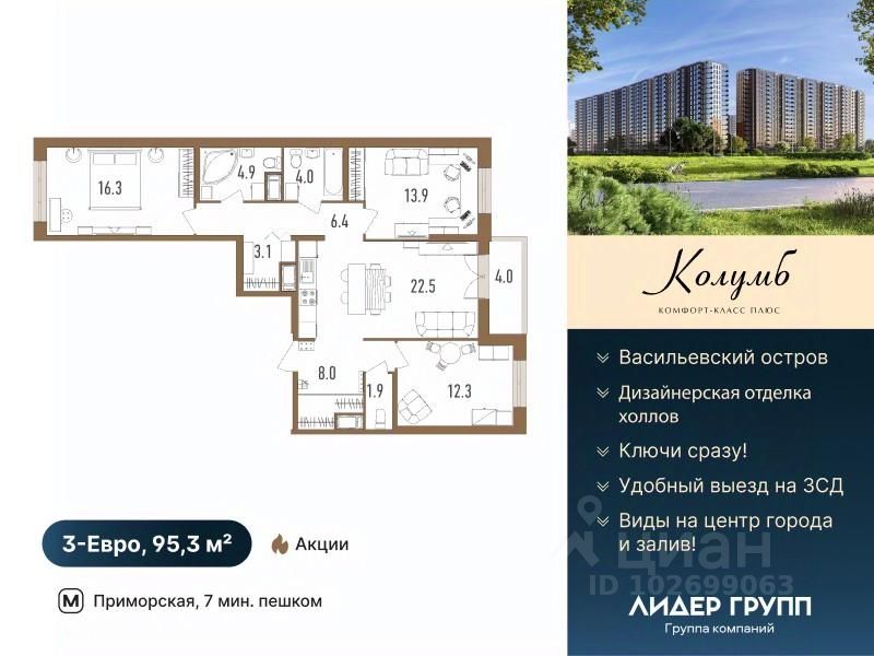 ЖК "Колумб" — готовый дом класса "комфорт+" в составе современного жилого квартала на намывных территориях Васильевского острова. Это безопасная среда: охраняемая территория и видеонаблюдение обеспечивают спокойствие жителей. А благодаря близости к станции метро "Приморская" вы всегда будете на связи с городом.