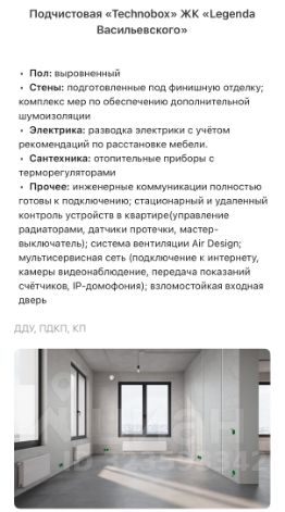 Продается просторная однокомнатная квартира с предчистовой отделкой в ЖК LEGENDA Васильевского.LEGENDA Васильевского жилой квартал в минутной доступности от Финского залива, главного креативного хаба Санкт-Петербурга Севкабель Порта и других точек притяжения.Современные инженерные и технические решения, повышающие качество жизни TechnoBox включают в себя: стационарный и удаленный контроль дома, систему вентиляции Air Design - здоровое дыхание без лишнего шума, мультисервисную сеть, объединяющую коммуникационные системы, удаленное управление электроприборами, контроль отопления в каждом помещении, поддерживающий оптимальный температурный баланс во время холодного периода, датчики протечки, датчик открытия входной двери.Квартира готова к декорированию. Застройщиком сделана шумоизоляция; стены подготовлены для отделки; проведена электрика с учетом рекомендаций по расстановке мебели и бытовой техники; выровнен пол. В каждой квартире установлена взломостойкая входная дверь, окна со специальным термоизолированным алюминиевым профилем.Двор жилого комплекса LEGENDA Васильевского закрыт. Проект состоит из шести разноформатных корпусов с ритмичными фасадами в духе пост-конструктивизма. Корпуса образуют периметр с общественными пространствами: площадью с кафе, магазинами и пешеходным променадом с детскими игровыми хабами, местами для спокойного отдыха и workout-зоной.