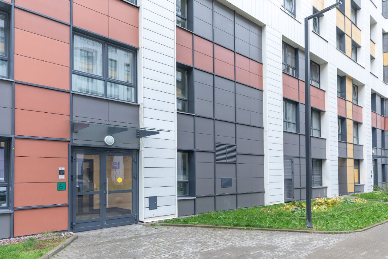 Навесные вентилируемые фасады выполнены из керамогранита белых оттенков с яркими акцентами. В каждой парадной есть места для колясок, а в подвальном этаже размещаются кладовые помещения.