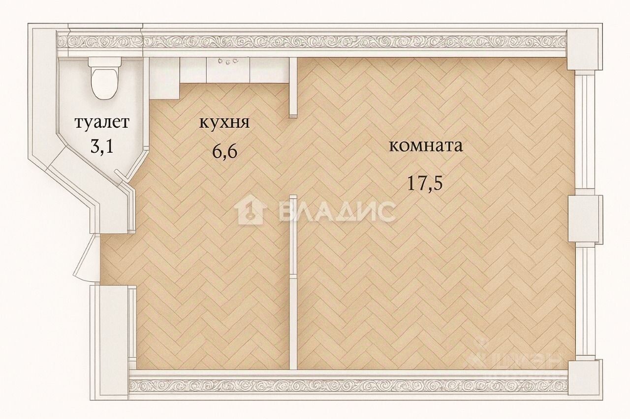 Квартира расположена в историческом здании эпохи северного модерна (построено в 1909 году по проекту архитектора А.И. Гаврилова), что объясняет наличие высоких потолков (3 метра), характерных для домов того времени. Площадь комнаты 17,5 м2, в которой удобно размещается просторное спальное место, система хранения и можно оборудовать рабочую зону. Квартира расположена на 2 этаже 5-этажного здания. Окна выходят на улицу.