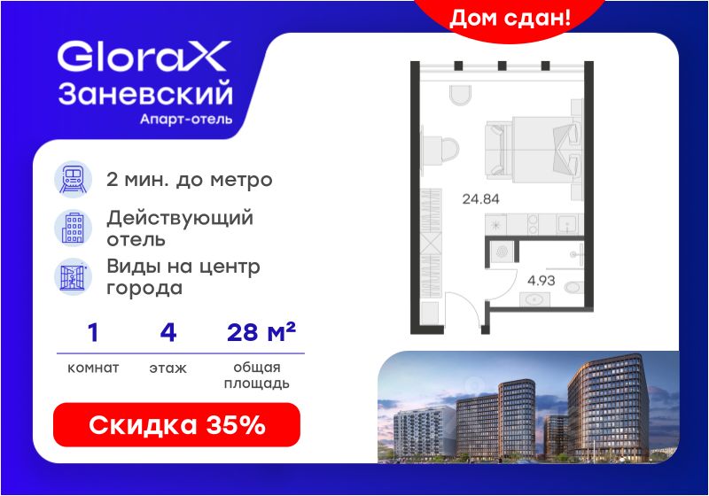 Продается апартамент-студия на 4-м этаже в сданном Апарт-комплексе бизнес-класса "GloraX Заневский". Ключи сразу! Общая площадь лота составляет 29,77 кв. м, из которых 24,84 кв. м отведено под жилую. Номер апартамента - 412.