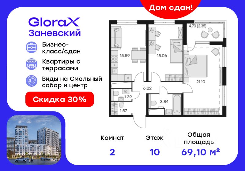 Продается 2-комн. квартира на 10-м этаже в проекте бизнес-класса GloraX Заневский. Общая площадь лота составляет 67,12 кв. м, из которых 36,16 кв. м отведено под жилую и 15,59 кв. м под кухонную зону. Номер квартиры - 53.