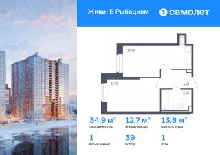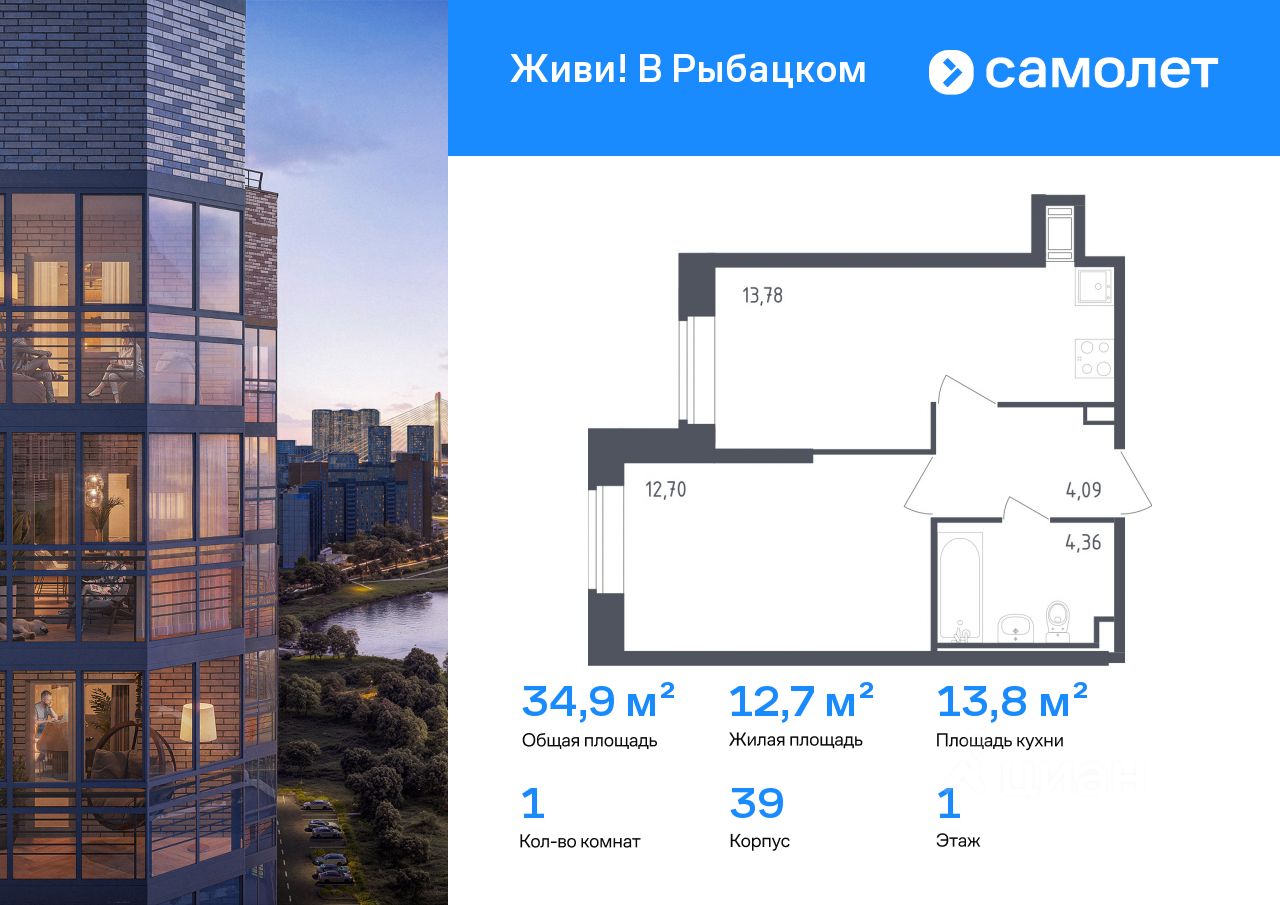 Строим кварталы для жизни с заботой о будущем. Предлагается 1-комнатная квартира комфорт-класса 34,93 кв.м в корпусе 39 на 1 этаже, в ЖК "Живи! В Рыбацком"