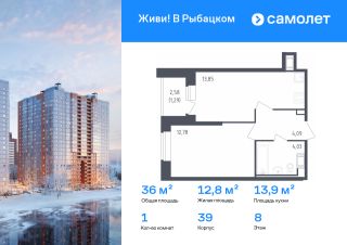 Строим кварталы для жизни с заботой о будущем. Предлагается 1-комнатная квартира комфорт-класса 36,04 кв.м в корпусе 39 на 8 этаже, в ЖК "Живи! В Рыбацком"