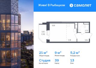 Строим кварталы для жизни с заботой о будущем. Предлагается квартира студия комфорт-класса 21,04 кв.м в корпусе 39 на 13 этаже, в ЖК "Живи! В Рыбацком"