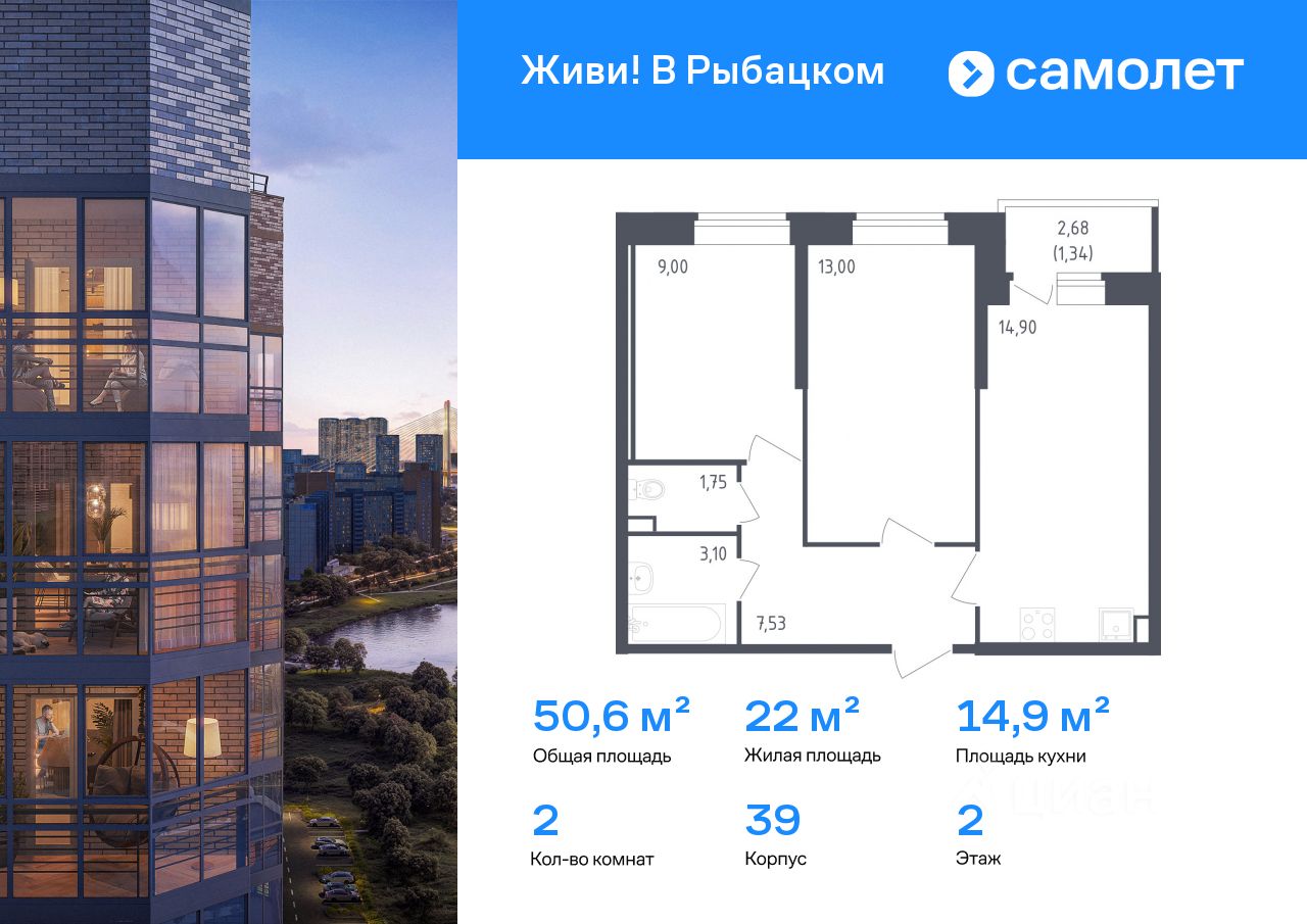 Строим кварталы для жизни с заботой о будущем. Предлагается 2-комнатная квартира комфорт-класса 50,62 кв.м в корпусе 39 на 2 этаже, в ЖК "Живи! В Рыбацком"