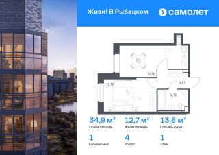 Строим кварталы для жизни с заботой о будущем. Предлагается 1-комнатная квартира комфорт-класса 34,93 кв.м в корпусе 4 на 1 этаже, в ЖК "Живи! В Рыбацком"