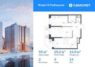 Строим кварталы для жизни с заботой о будущем. Предлагается 2-комнатная квартира комфорт-класса 55 кв.м в корпусе 4 на 14 этаже, в ЖК "Живи! В Рыбацком"