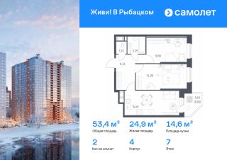 Строим кварталы для жизни с заботой о будущем. Предлагается 2-комнатная квартира комфорт-класса 53,43 кв.м в корпусе 4 на 7 этаже, в ЖК "Живи! В Рыбацком"