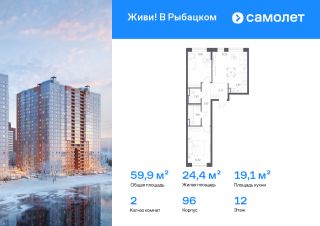 Строим кварталы для жизни с заботой о будущем. Предлагается 2-комнатная квартира комфорт-класса 59,9 кв.м в корпусе 96 на 12 этаже, в ЖК "Живи! В Рыбацком"