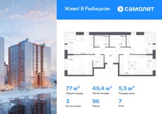 Строим кварталы для жизни с заботой о будущем. Предлагается 3-комнатная квартира комфорт-класса 77,04 кв.м в корпусе 96 на 7 этаже, в ЖК "Живи! В Рыбацком"