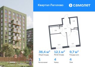 Строим кварталы для жизни с заботой о будущем. Предлагается 1-комнатная квартира комфорт-класса 36,43 кв.м в корпусе 4 на 4 этаже, в ЖК "Квартал Лаголово"