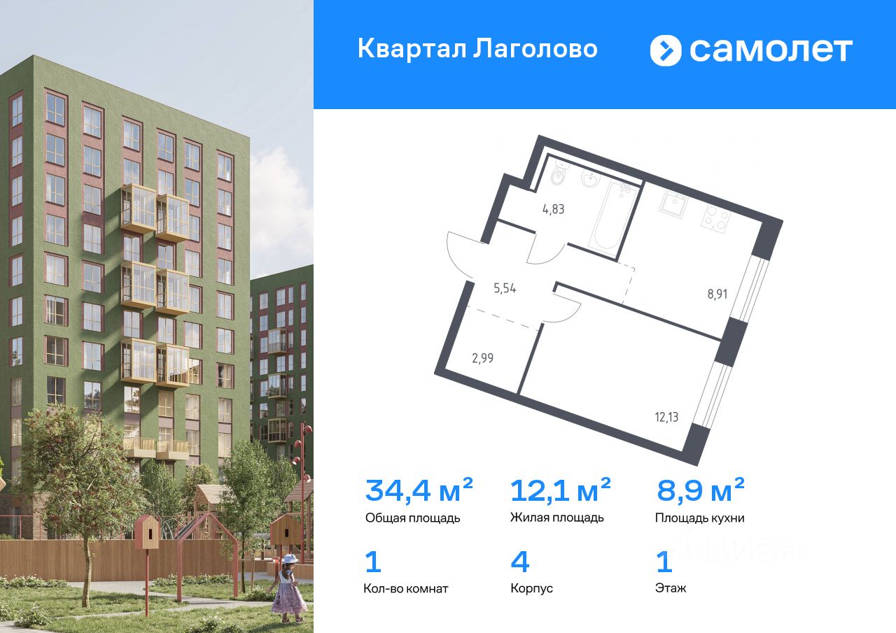Строим кварталы для жизни с заботой о будущем. Предлагается 1-комнатная квартира комфорт-класса 34,4 кв.м в корпусе 4 на 1 этаже, в ЖК "Квартал Лаголово"