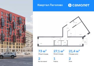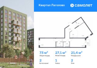 Строим кварталы для жизни с заботой о будущем. Предлагается 2-комнатная квартира комфорт-класса 73,03 кв.м в корпусе 1 на 2 этаже, в ЖК "Квартал Лаголово"