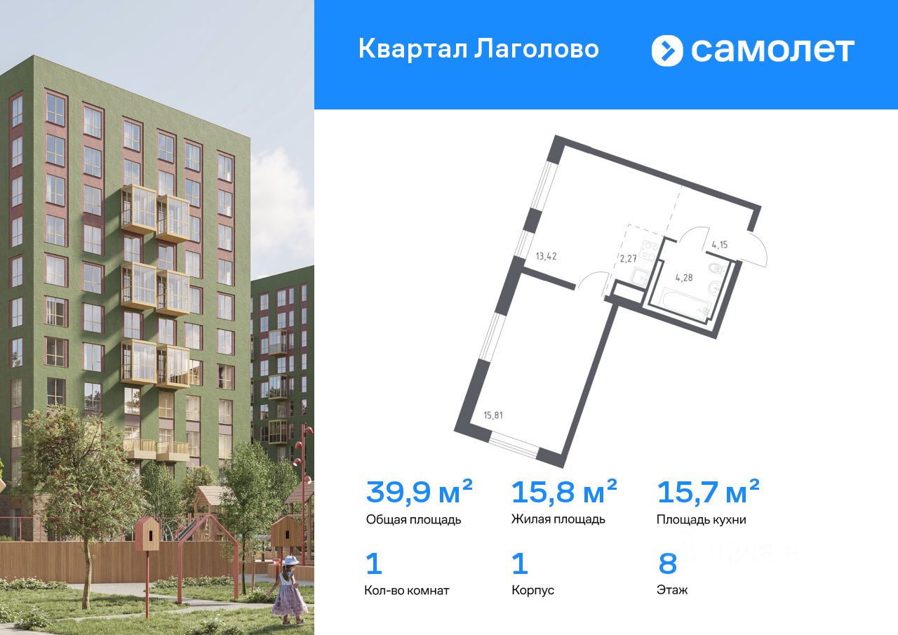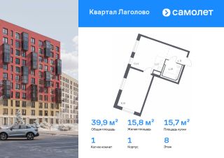 Строим кварталы для жизни с заботой о будущем. Предлагается 1-комнатная квартира комфорт-класса 39,93 кв.м в корпусе 1 на 8 этаже, в ЖК "Квартал Лаголово"
