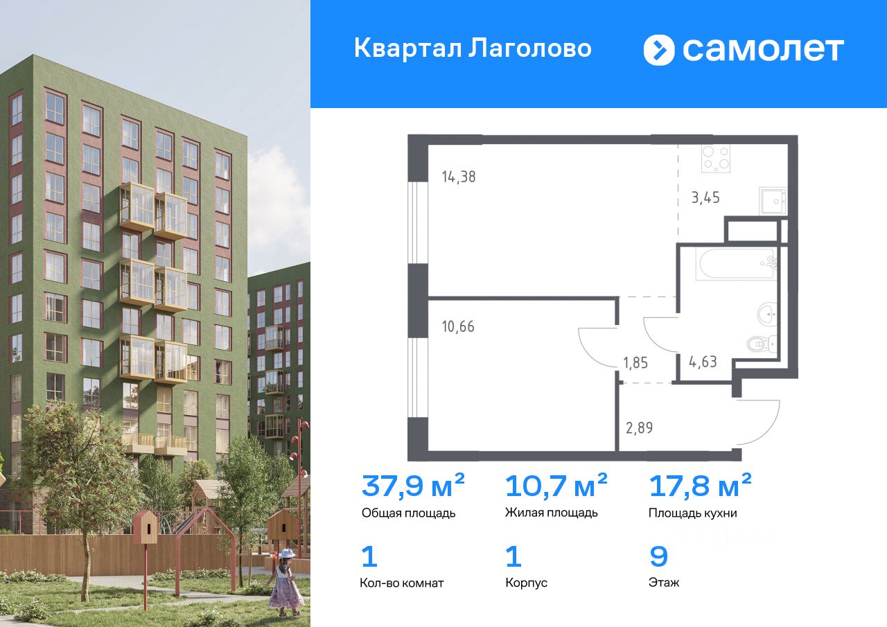 Строим кварталы для жизни с заботой о будущем. Предлагается 1-комнатная квартира комфорт-класса 37,86 кв.м в корпусе 1 на 9 этаже, в ЖК "Квартал Лаголово"