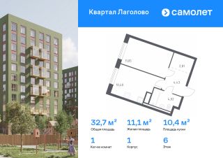 Строим кварталы для жизни с заботой о будущем. Предлагается 1-комнатная квартира комфорт-класса 32,71 кв.м в корпусе 1 на 6 этаже, в ЖК "Квартал Лаголово"