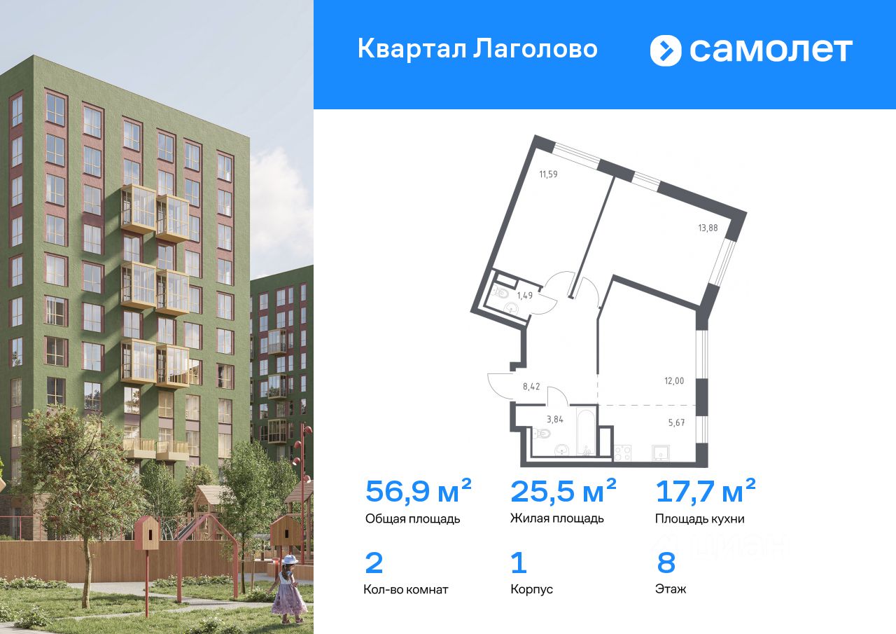 Строим кварталы для жизни с заботой о будущем. Предлагается 2-комнатная квартира комфорт-класса 56,89 кв.м в корпусе 1 на 8 этаже, в ЖК "Квартал Лаголово"