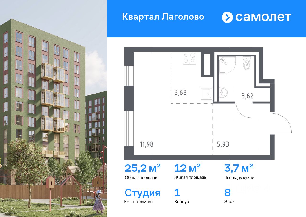 Строим кварталы для жизни с заботой о будущем. Предлагается квартира студия комфорт-класса 25,21 кв.м в корпусе 1 на 8 этаже, в ЖК "Квартал Лаголово"