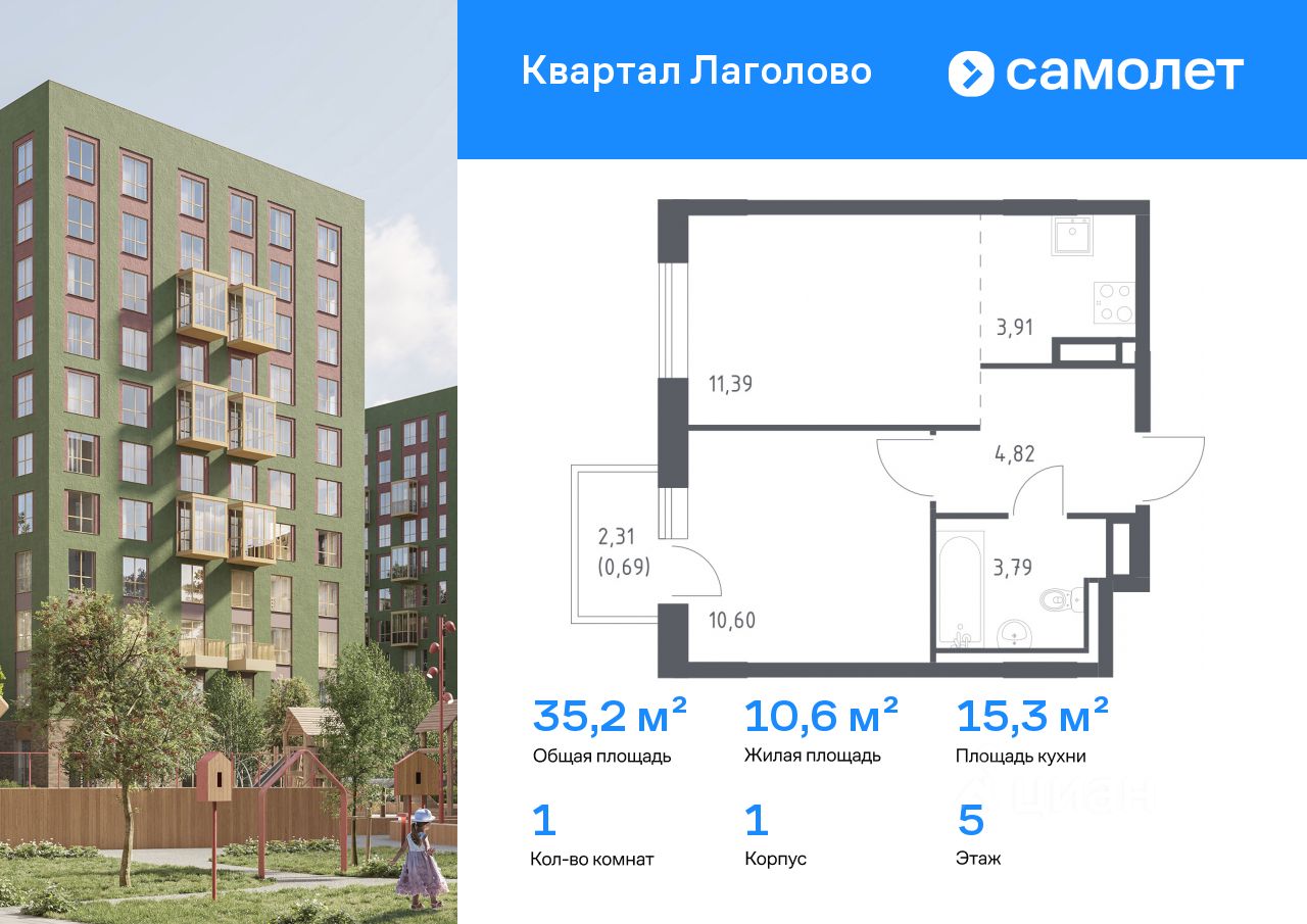 Строим кварталы для жизни с заботой о будущем. Предлагается 1-комнатная квартира комфорт-класса 35,2 кв.м в корпусе 1 на 5 этаже, в ЖК "Квартал Лаголово"