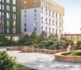 Дома высотой до 11 этажей с панорамными балконами выполнены в скандинавском стиле.