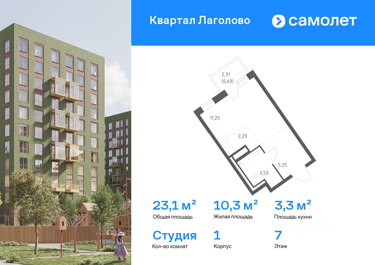Строим кварталы для жизни с заботой о будущем. Предлагается квартира студия комфорт-класса 23,07 кв.м в корпусе 1 на 7 этаже, в ЖК "Квартал Лаголово"