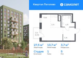 Строим кварталы для жизни с заботой о будущем. Предлагается квартира студия комфорт-класса 27,48 кв.м в корпусе 1 на 5 этаже, в ЖК "Квартал Лаголово"