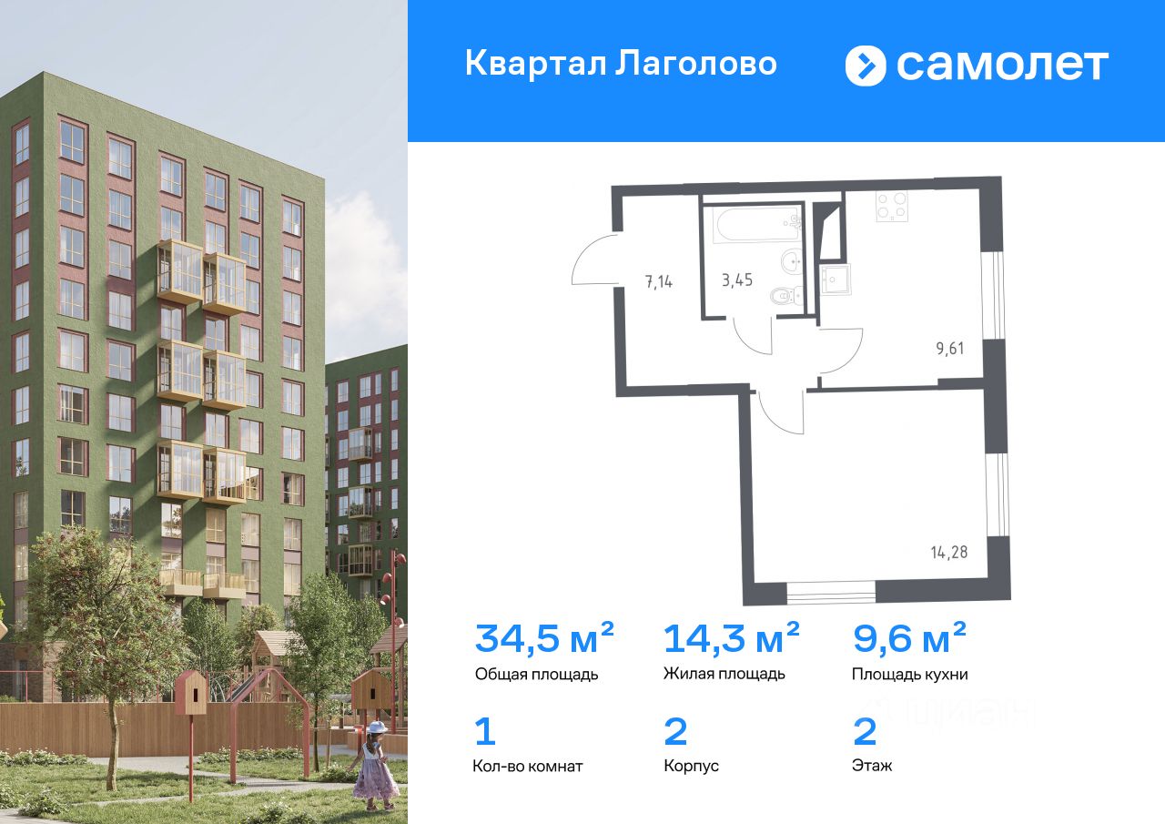 Строим кварталы для жизни с заботой о будущем. Предлагается 1-комнатная квартира комфорт-класса 34,48 кв.м в корпусе 2 на 2 этаже, в ЖК "Квартал Лаголово"