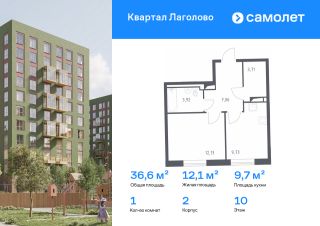 Строим кварталы для жизни с заботой о будущем. Предлагается 1-комнатная квартира комфорт-класса 36,55 кв.м в корпусе 2 на 10 этаже, в ЖК "Квартал Лаголово"